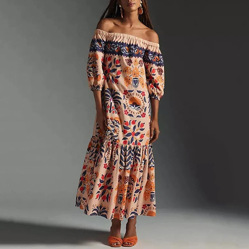 La robe Acacia™ est votre compagnon pour un style sans effort et un charme incomparable, parfait pour chaque saison. Cette superbe robe longue à épaules dénudées présente une coupe ample et des motifs complexes qui évoquent un sentiment d'envie de voyager et de liberté. Que vous assistiez à un festival d'été ou que vous passiez une journée de détente, la robe Acacia™ vous fera ressortir avec son style bohème.