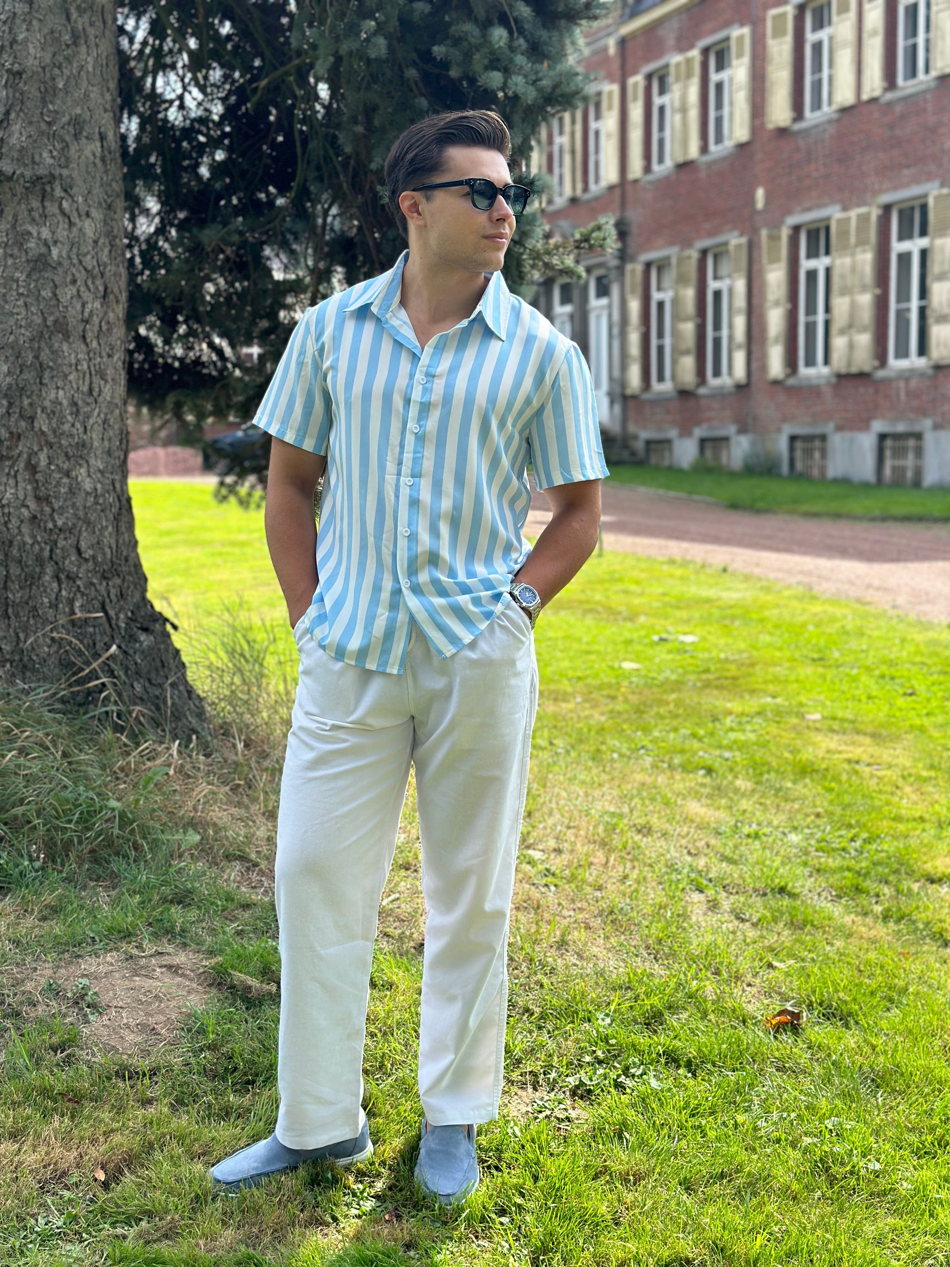 Associé à des lunettes de soleil discrètes , une montre en acier inoxydable Pladen et des mocassins en daim, l'ensemble est parfait pour ceux qui apprécient le luxe discret et le charme sans effort. Idéal pour les promenades sur la plage ou les week-ends .