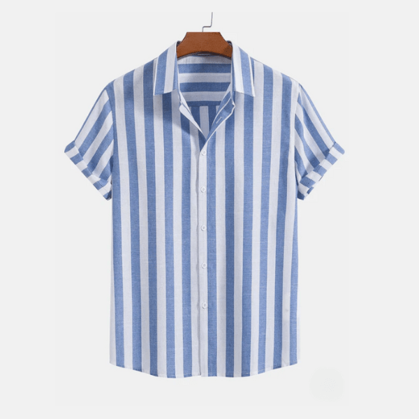 L' ensemble Davinci™ Azure Zen incarne l'élégance décontractée avec une chemise à rayures bleues et un pantalon blanc impeccable , idéal pour un look élégant et décontracté les jours d'été .