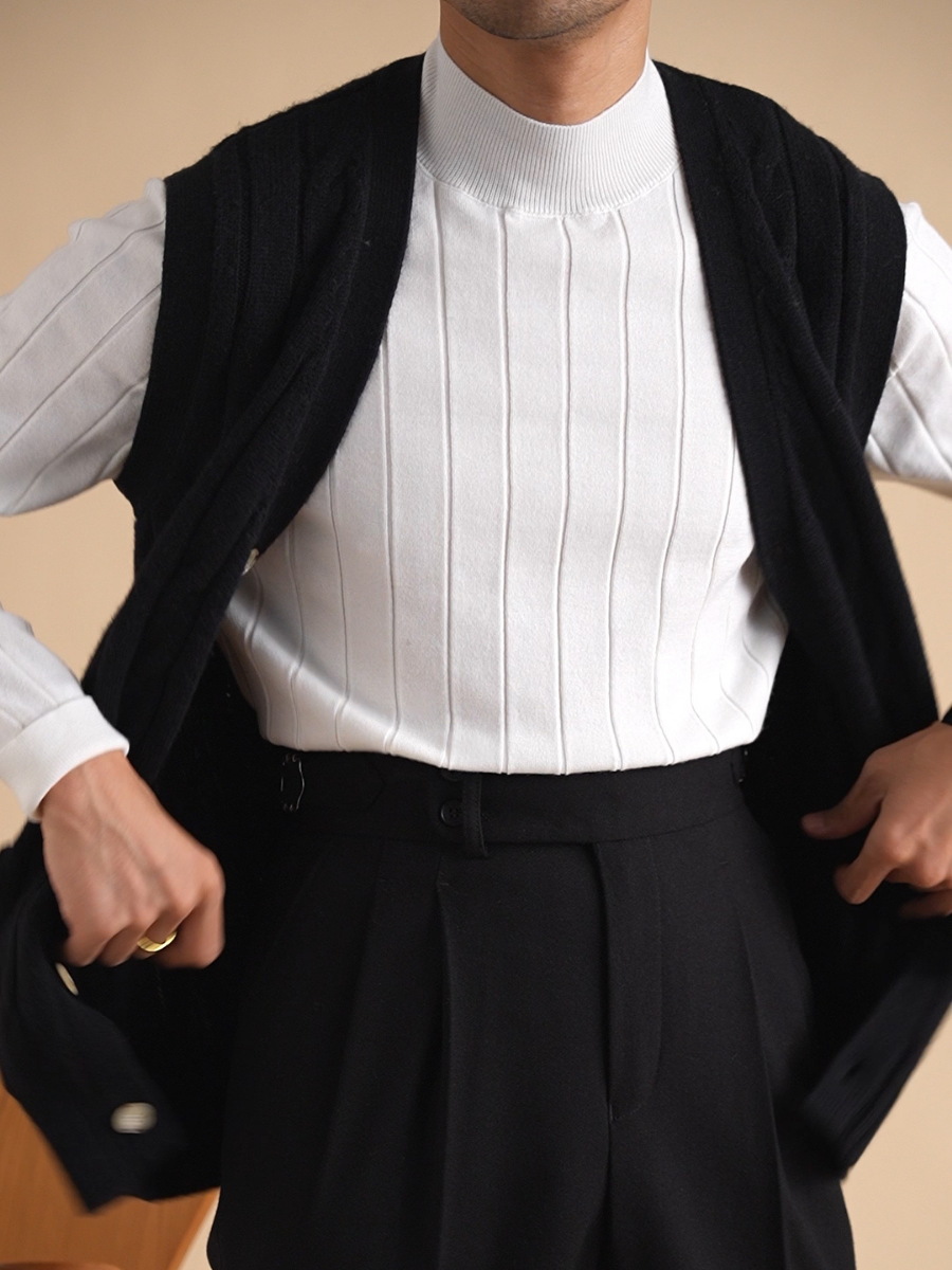 Ce pull à col roulé côtelé verticalement est conçu pour l'homme moderne qui apprécie à la fois le style et le confort. Le motif côtelé vertical allonge le torse pour un look mince et structuré, tandis que le col roulé ajoute une touche élégante. Fabriqué à partir d'un mélange luxueux de 42,3 % polyester, 32 % acrylique, 19,8 % nylon, 3 % soie de mûrier et 2,9 % laine, ce pull offre douceur et chaleur tout en restant léger. Idéal pour la superposition ou comme pièce autonome, il est disponible en trois couleurs polyvalentes : blanc, gris et noir.