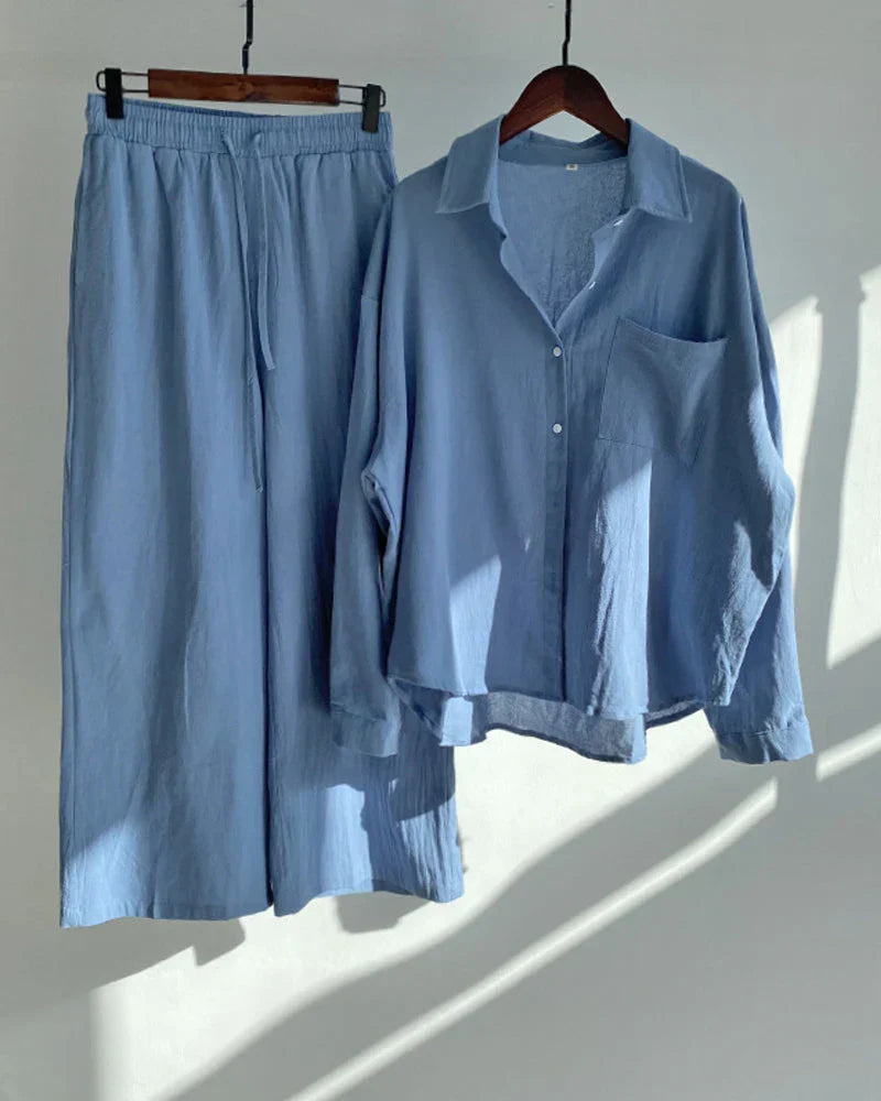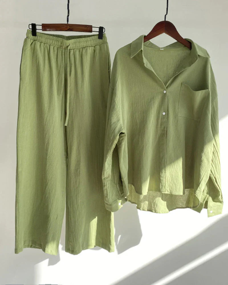 Ensemble deux pièces de couleur unie avec chemise et pantalon