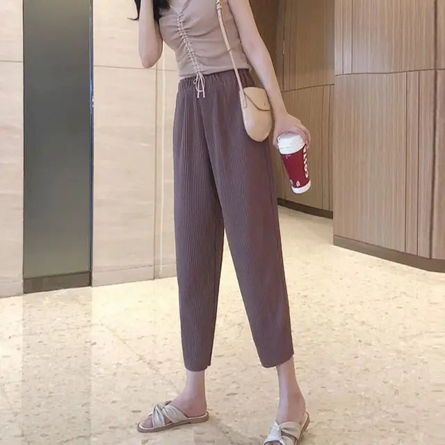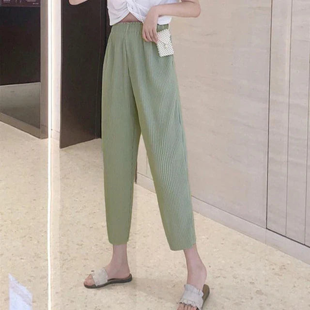 Die Hose zeichnet sich durch eine entspannte Haremssilhouette aus, die sich bis zu den Knöcheln verjüngt und einen schmeichelhaften Fall bietet, der sowohl bequem als auch schick ist. Das High-Waist-Design, ergänzt durch einen bequemen, verstellbaren Kordelzug, sorgt für eine individuelle Passform, die die Taille betont und die Beine optisch verlängert.