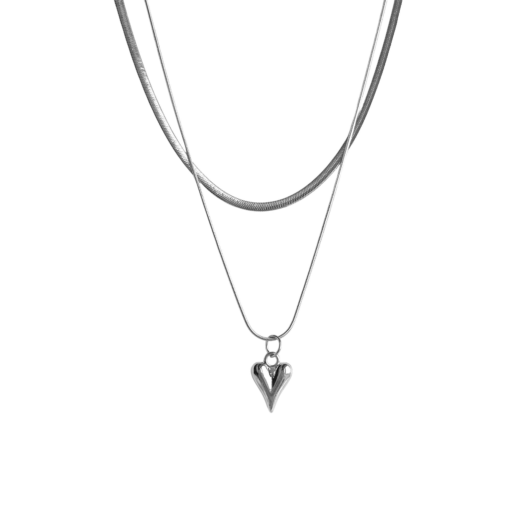 Moderne silberne Doppel-Halskette mit Herzanhänger und breiter flacher Kette: Ein Statement-Schmuckstück