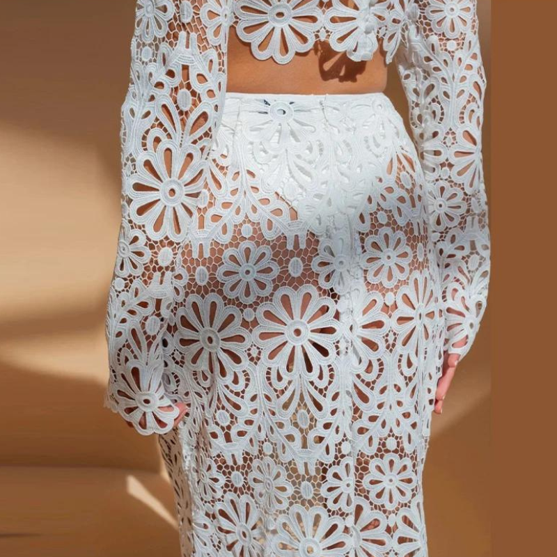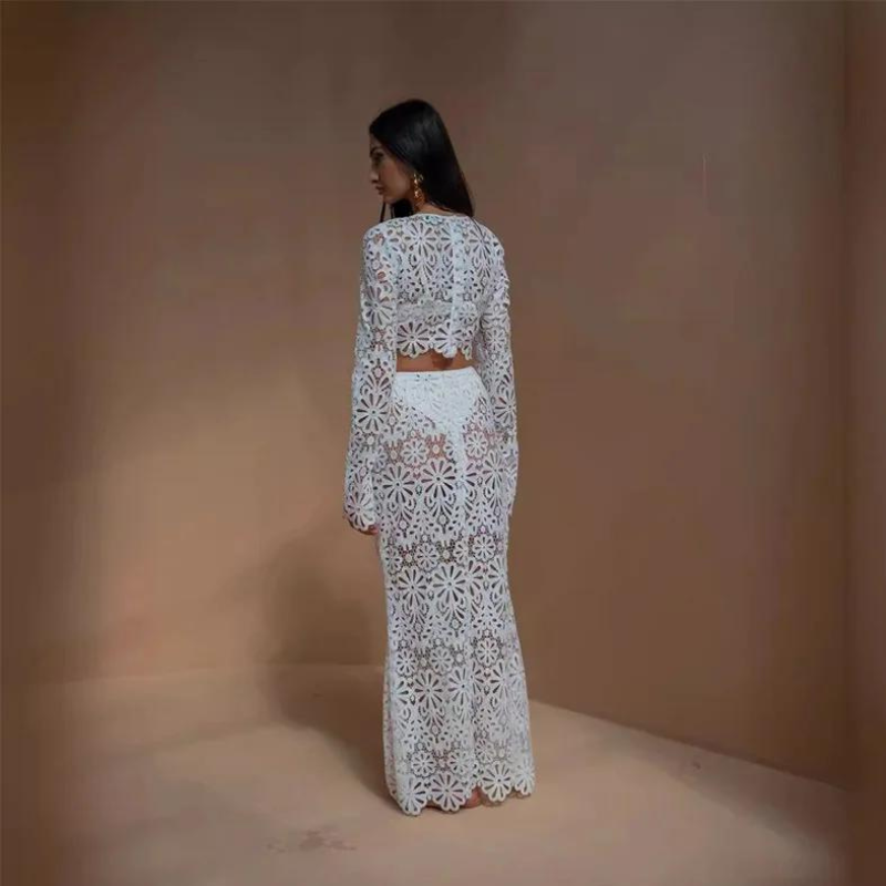 Das Cleopatra™ Sommeroutfit ist eine perfekte Mischung aus Eleganz und Komfort. Dieses Ensemble besteht aus einem luxuriösen Langarm-Spitzenoberteil und einem fließenden langen Rock, ideal für sowohl legere als auch formelle Sommeranlässe.