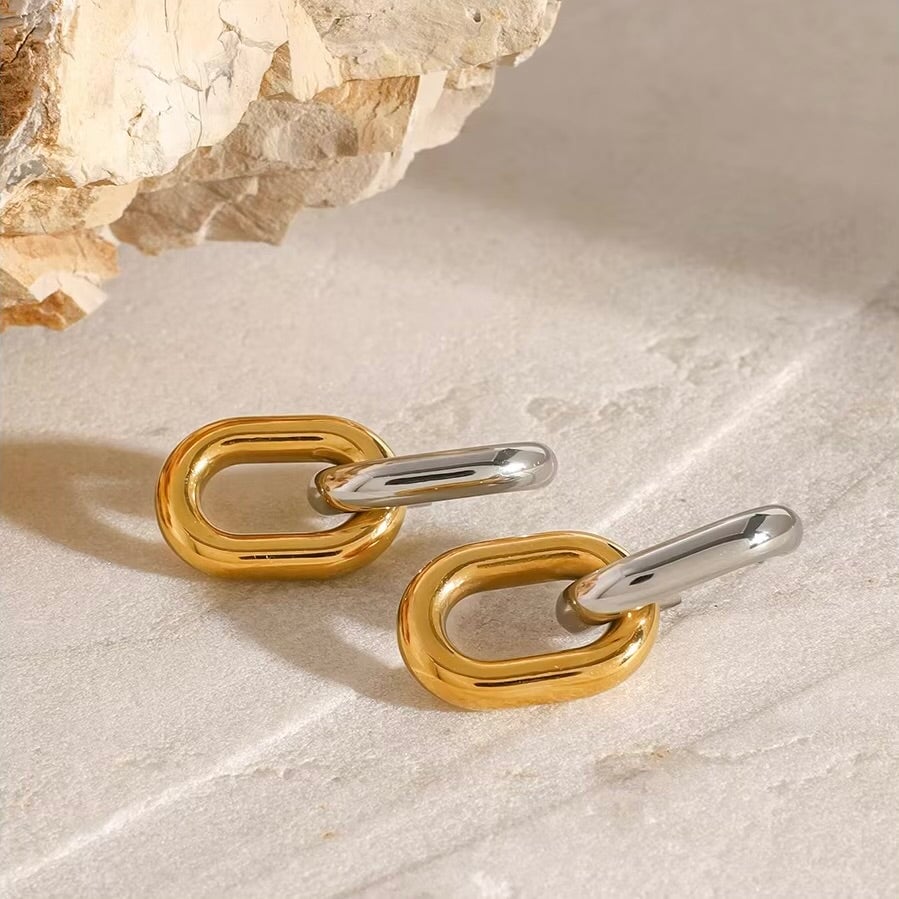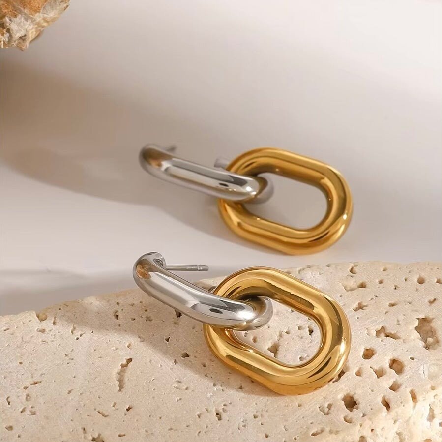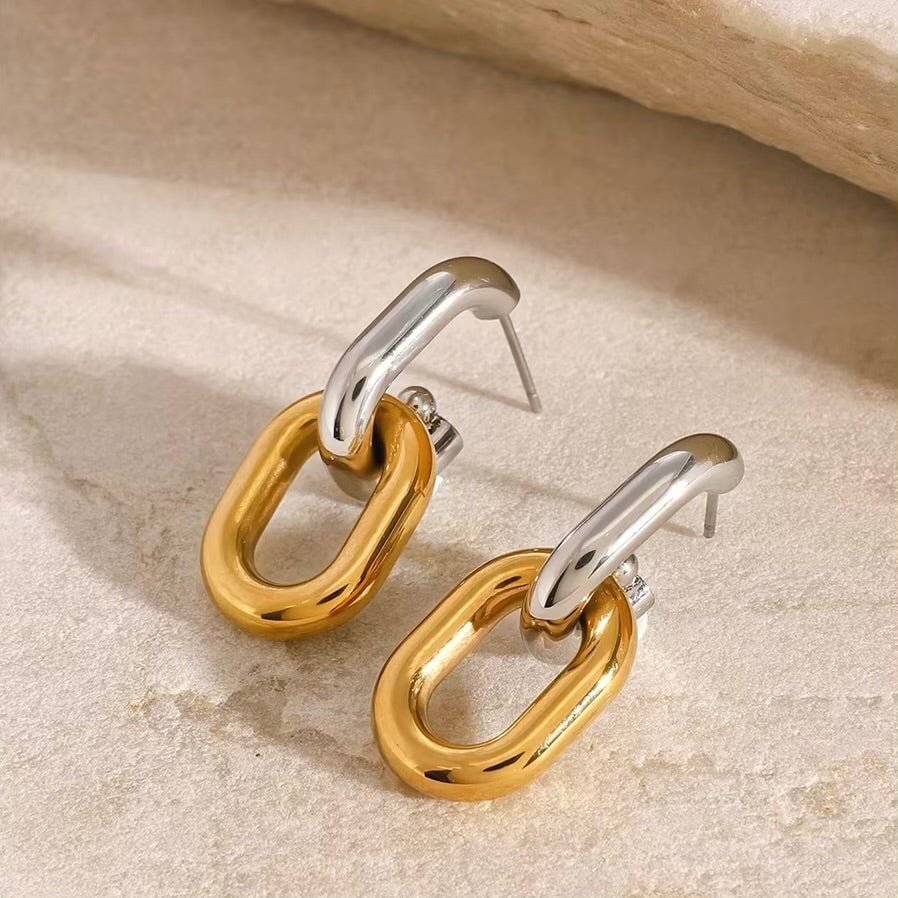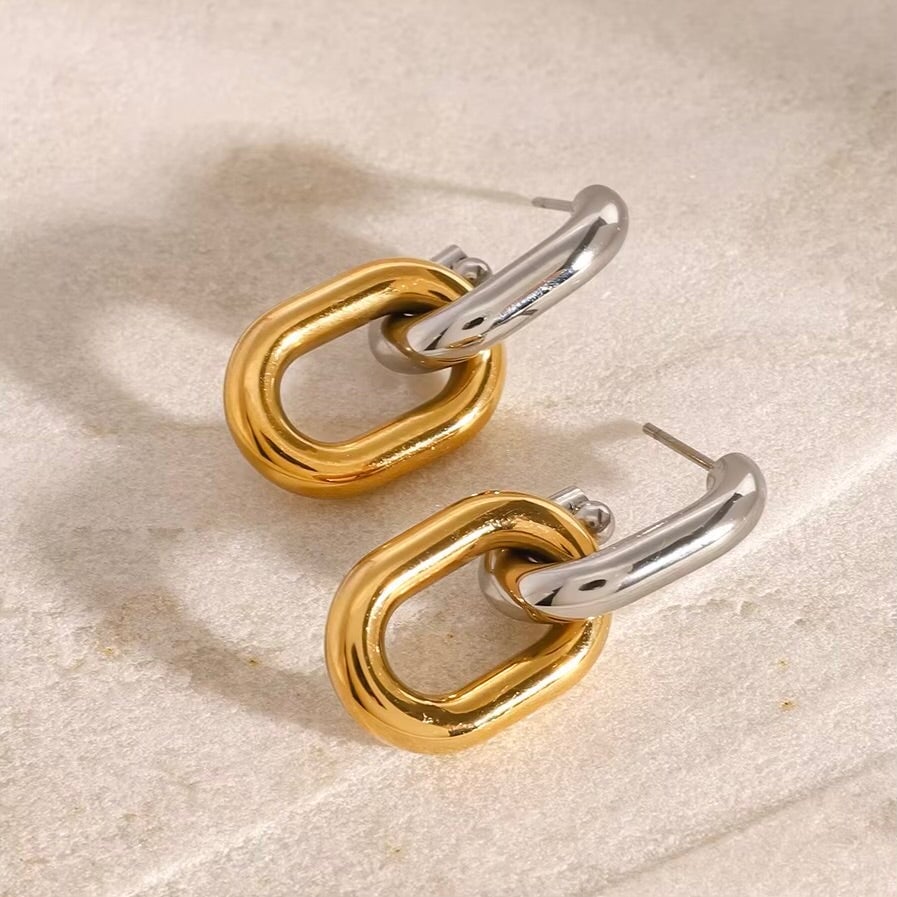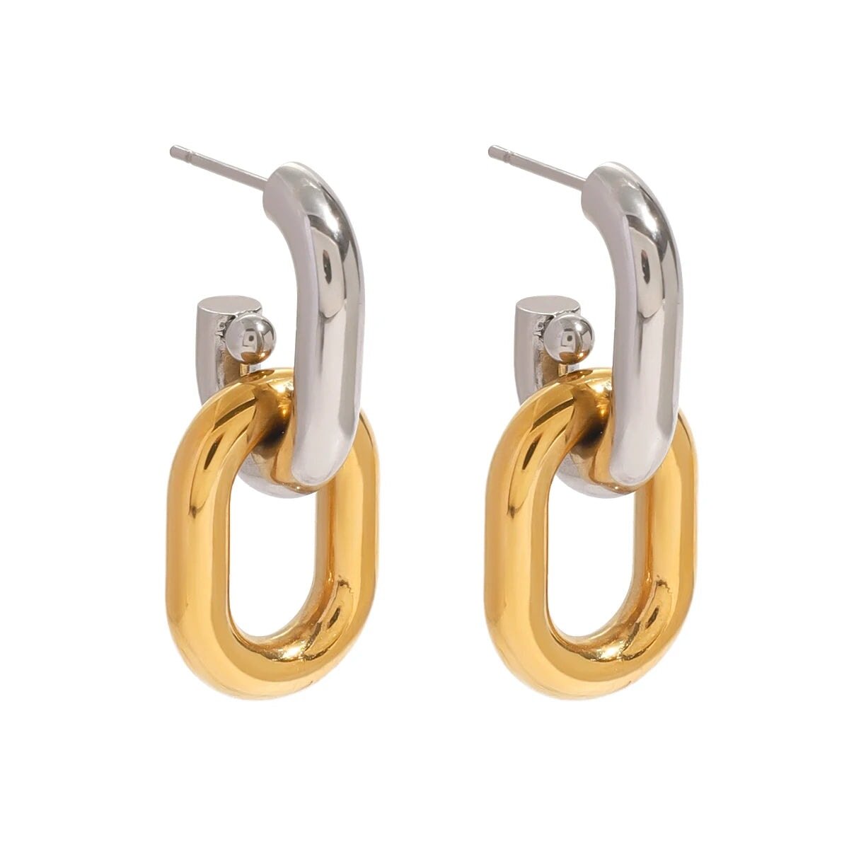 Entdecke die Schönheit unserer gold-silbernen Hoops mit abgerundeten Rechtecken – ein elegantes Must-have, das moderne Form und zeitlosen Stil vereint. Diese außergewöhnlichen Ohrstecker kombinieren die warme Ausstrahlung von Gold mit der kühlen Eleganz von Silber und schaffen so ein harmonisches, kontrastreiches Design, das Deinen Look perfekt abrundet.
