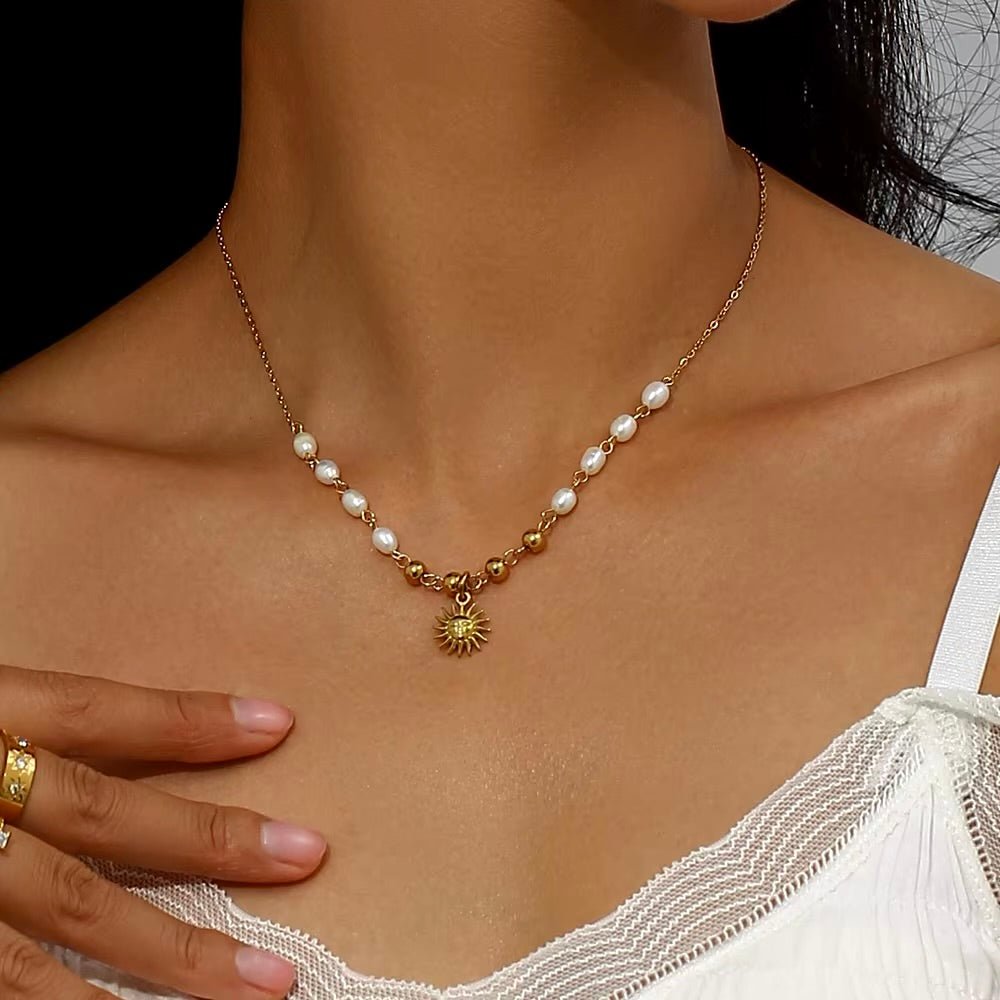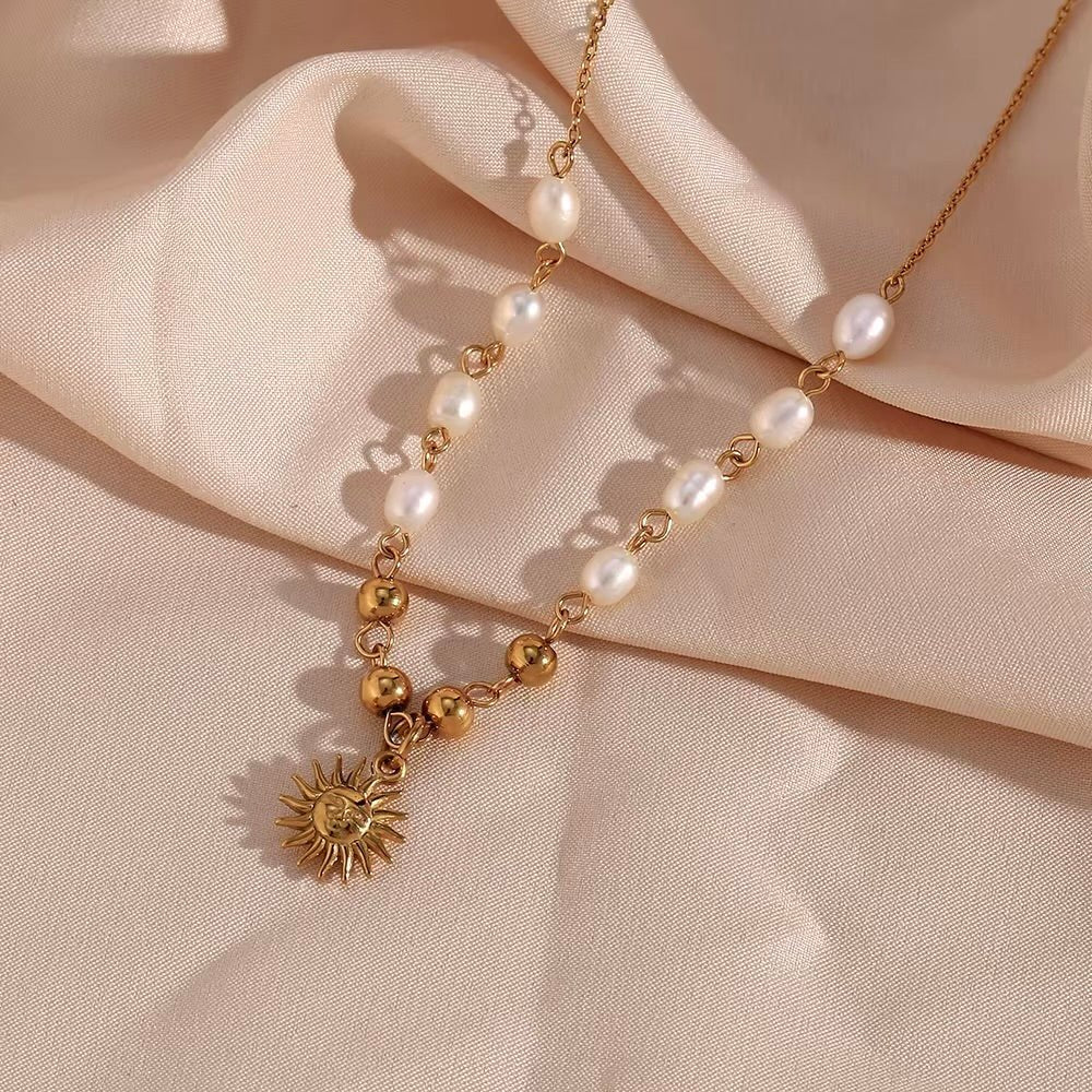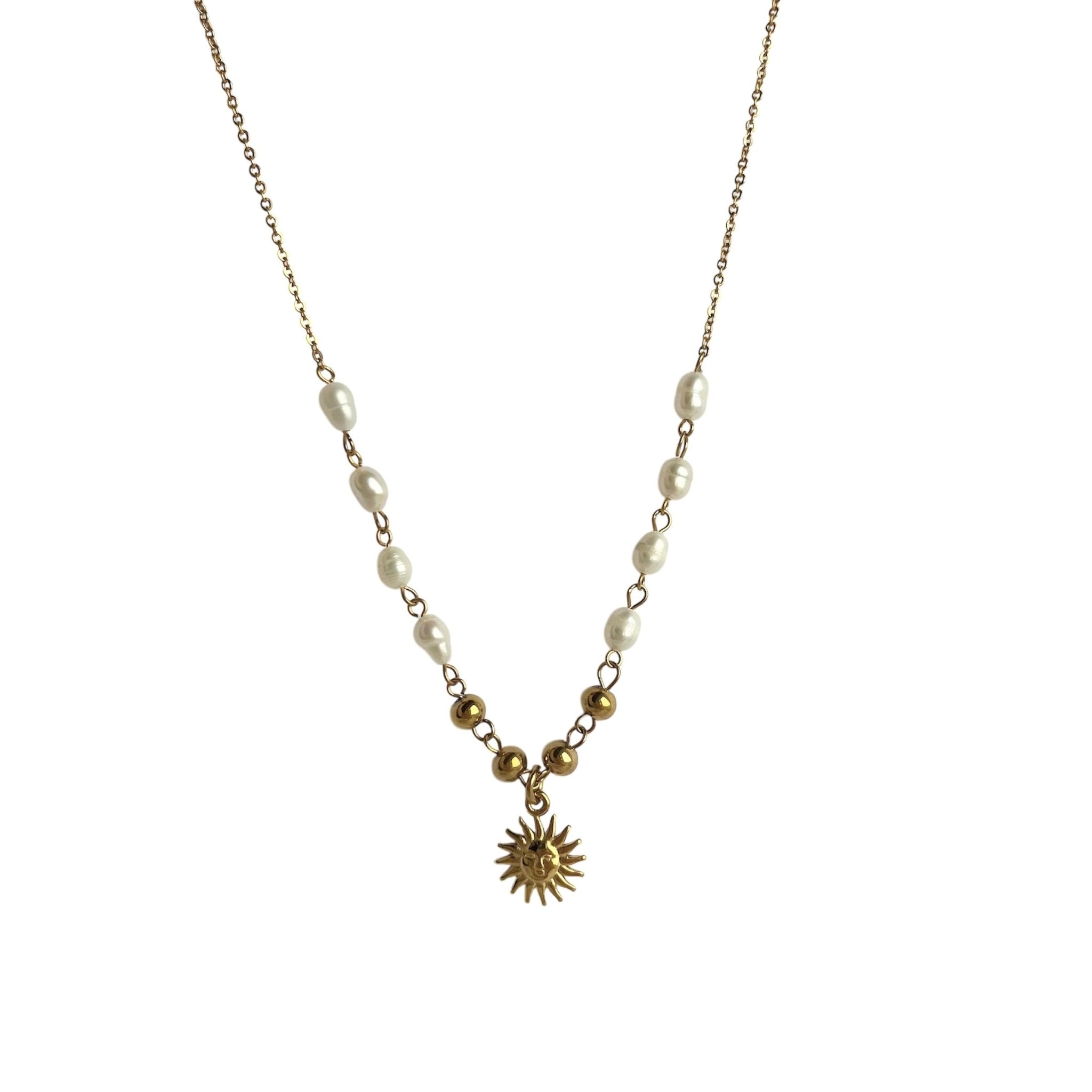 Strahle mit dieser zarten Kette aus Süßwasserperlen, goldenen Perlen und einem Sonnen-Anhänger wie die Sonne selbst. Diese elegante Halskette kombiniert natürliche Süßwasserperlen mit feinen, goldenen Akzenten und einem kleinen Sonnen-Anhänger, der Deinem Look eine strahlende, warme Note verleiht. Das harmonische Zusammenspiel der edlen Perlen und des goldenen Glanzes macht diese Kette zu einem einzigartigen und zeitlosen Accessoire.