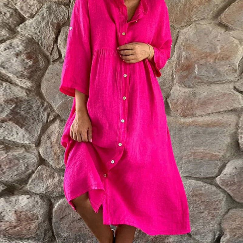 Wir stellen unser neuestes Modell vor: das Freizeitkleid Greta - Baumwollmischung! Mit einem einreihigen Knopfverschluss lässt es sich leicht an- und ausziehen und bietet einen klassischen und stilvollen Look. Die lockere Passform und die 3/4-Ärmel machen dieses lange Kleid zu einer perfekten Kombination aus Komfort und Eleganz. Das Kleid ist für die moderne Frau gedacht, die Schlichtheit und Stil schätzt, ohne auf Komfort zu verzichten.