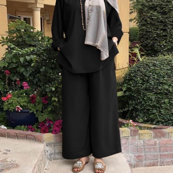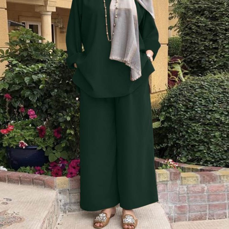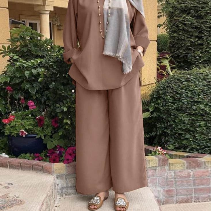 Dieses zweiteilige Set ist die perfekte Kombination aus Stil und Komfort. Die Bluse mit den lockeren Ärmeln ist elegant und schmeichelhaft, mit einem Hauch von Raffinesse. Die Hose mit weitem Bein ist bequem und sorgt für eine tolle Silhouette, ohne zu eng zu sein.