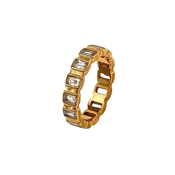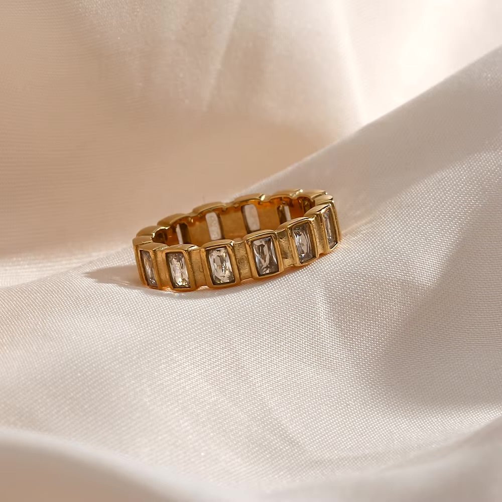 Lass deinen Stil erstrahlen mit dem Eisprisma-Ring. Dieses Schmuckstück aus hochwertigem Edelstahl mit 18k Goldplattierung begeistert durch klare, rechteckige Zirkonia-Steine, die das Licht wie Eisprismen reflektieren. Perfekt für die Weihnachtszeit, um deinem Look Eleganz und festliche Magie zu verleihen.