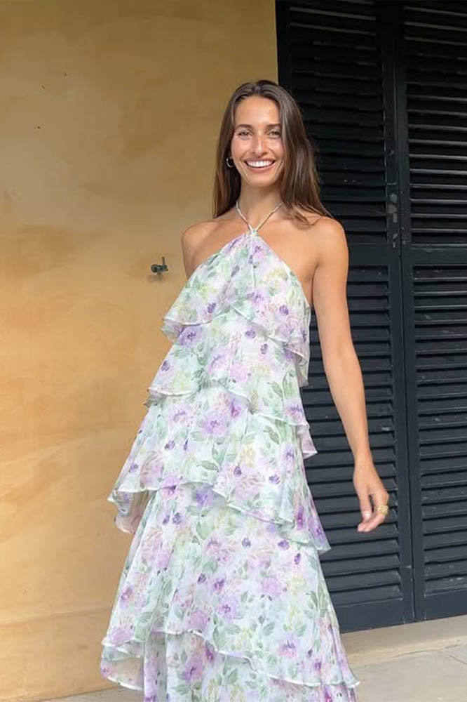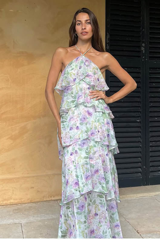 This halter maxi dress features a stylish layered print and elegant tie-neck design. The flowing silhouette and soft fabric offer both comfort and charm, making it perfect for summer vacations, beach strolls, or relaxed garden parties.