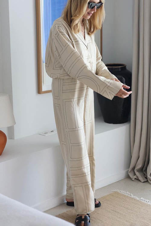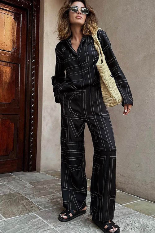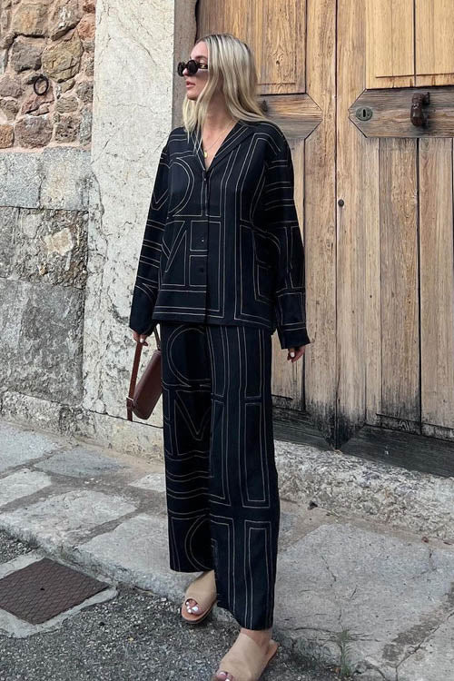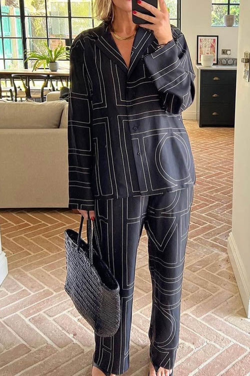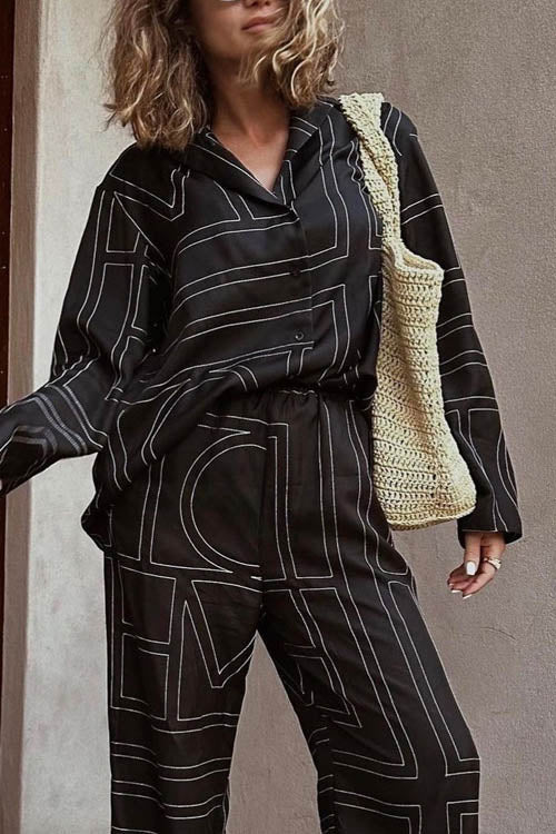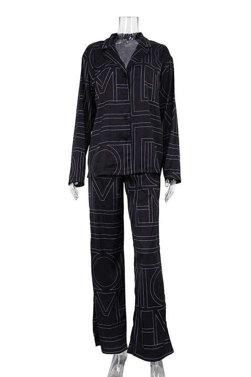 This autumn-ready satin set combines comfort with bold style. Featuring a letter print button-up shirt with a classic collar and matching elastic-waist pants, it delivers a sleek, coordinated look. The smooth, glossy fabric adds a luxe feel, perfect for casual days or elevated lounging.