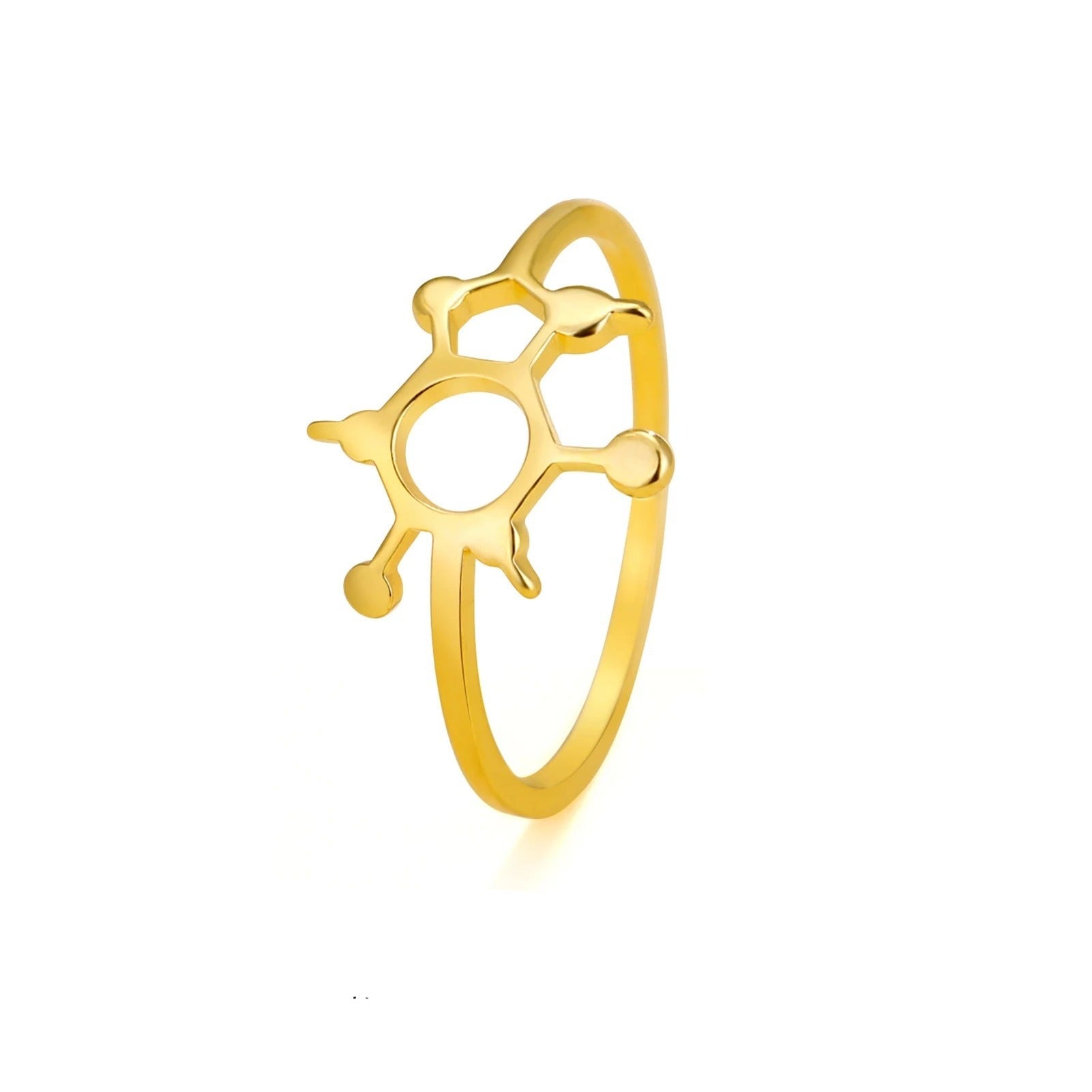 Entdecke den Mia's Goldener Ring mit einzigartigem Design, eine Fusion aus modischem Design und wissenschaftlicher Inspiration. Dieser Ring in der Form eines chemischen Moleküls ist das perfekte Accessoire für Frauen, die ihre Liebe zur Wissenschaft mit einem Trend-Statement verbinden möchten. Er repräsentiert nicht nur deine Intelligenz, sondern auch deinen einzigartigen Stil.