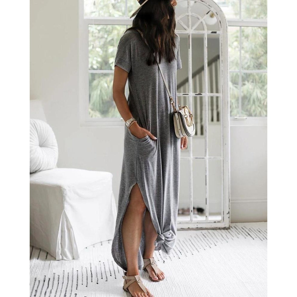 Zusätzlich bietet dieses Maxi-Kleid eine praktische Tasche, die genug Platz für Ihr Handy, Ihre Schlüssel oder kompakte Kosmetik bietet. Diese perfekte Kombination aus Mode und Funktionalität macht das Maxi T-Shirt-Kleid zu einer großartigen Ergänzung für Ihre Garderobe. Verabschieden Sie sich von der Qual der Wahl zwischen Stil und Komfort - mit diesem Kleid genießen Sie beides. Es bietet eine einfache, aber stilvolle Lösung für Ihre alltäglichen Outfit-Probleme.