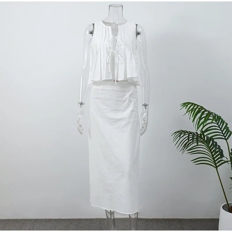 Erhöhen Sie Ihren Stil mit diesem eleganten zweiteiligen Set. Die Rüschenbluse und der lange Rock kombinieren sich zu einem eleganten und modernen Look. Ideal für jeden besonderen Anlass, lässt es Sie weiblich und selbstsicher fühlen.
