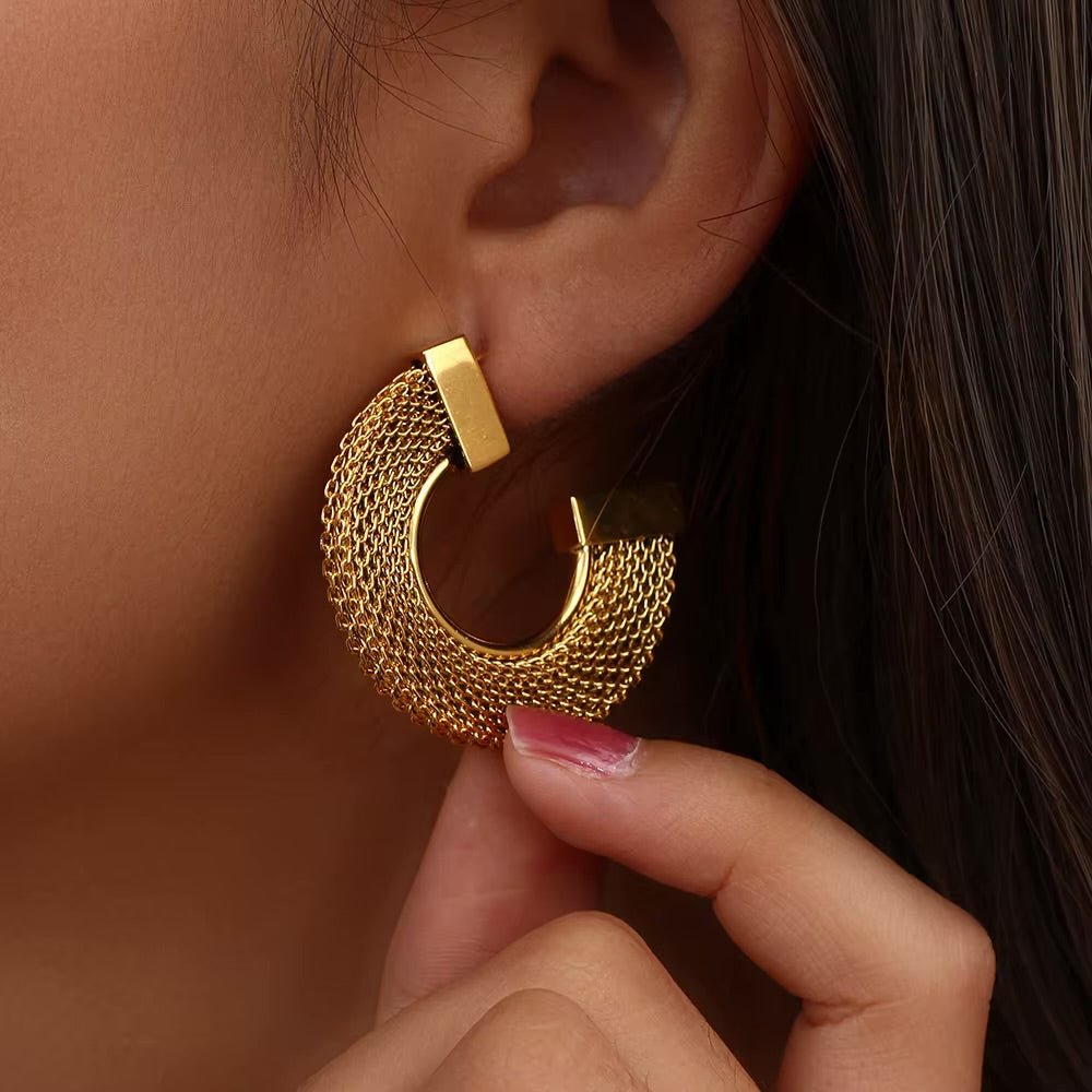 Entdecke die Eleganz der goldenen Mesh-Ohrringe, die modernen Stil mit zeitloser Raffinesse vereinen. Diese Statement-Ohrringe aus hochwertigem Edelstahl überzeugen mit ihrem filigranen, geflochtenen Netzdesign, das einen Hauch von Glamour verleiht. Perfekt für besondere Anlässe oder als Highlight für Dein Alltagsoutfit – diese Ohrringe sind vielseitig kombinierbar und ein wahrer Hingucker. Dank ihres leichten Tragekomforts und langlebigen Materials sind sie ein Must-have in jeder Schmuckkollektion.