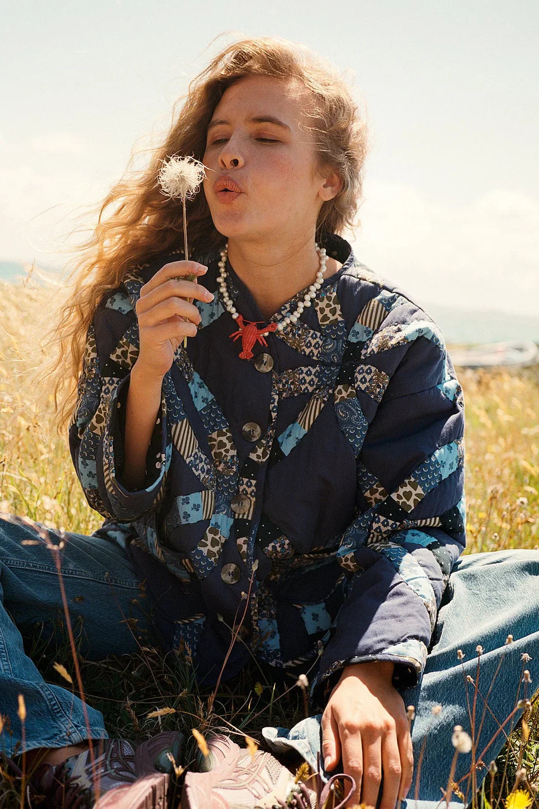 Die Steppjacke mit Vintage-Sari-Print bietet eine feine Balance aus lässigem Komfort und femininem Stil. Es besteht aus leichtem Stoff und weist exquisite kreisförmige Muster auf, die von Vintage-Sari-Drucken inspiriert sind und ihm ein einzigartiges und künstlerisches Flair verleihen. Mit ihren langen Ärmeln, der Knopfleiste und den zwei Vordertaschen ist diese Jacke sowohl stilvoll als auch funktionell, ideal für den Lagenlook und verleiht jedem Outfit Persönlichkeit.