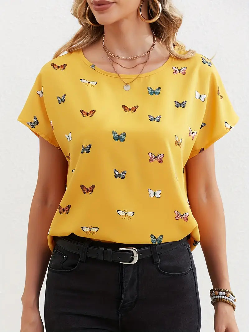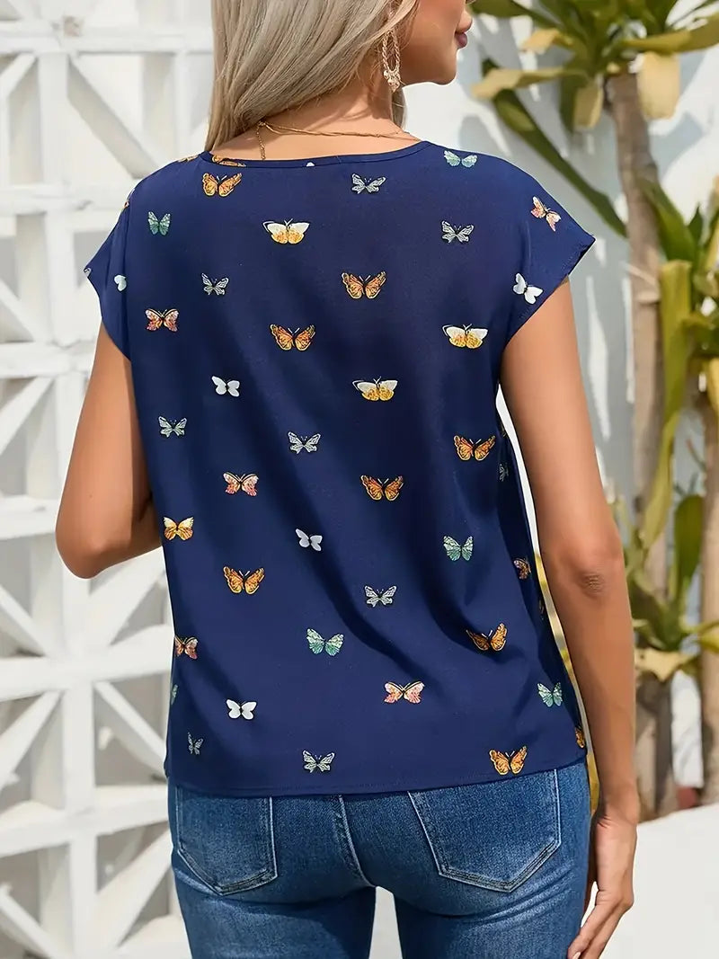 Tamika – bluse mit rundhalsausschnitt und schmetterlingsdruck für den frühling